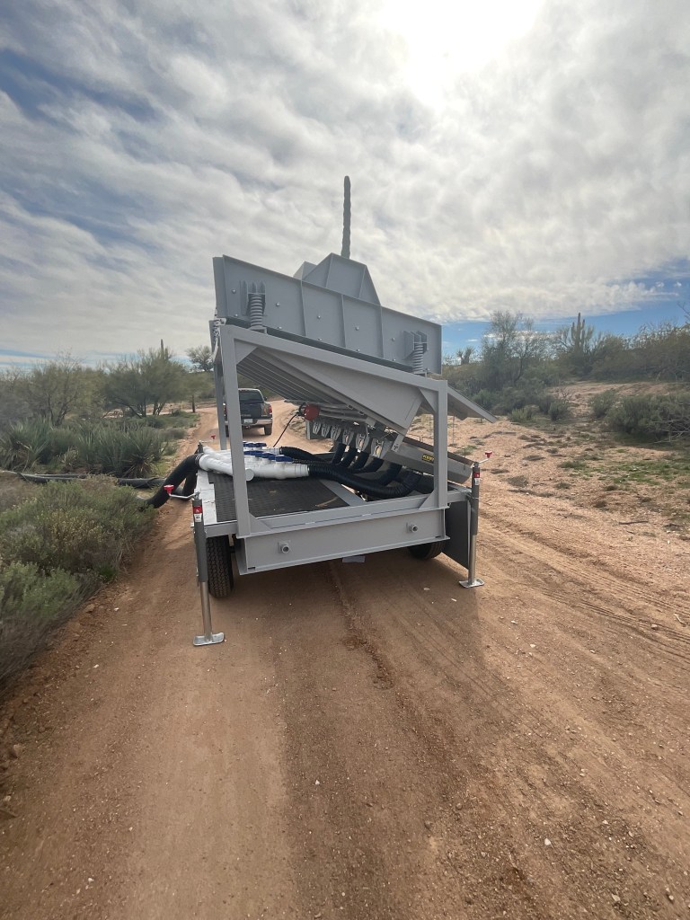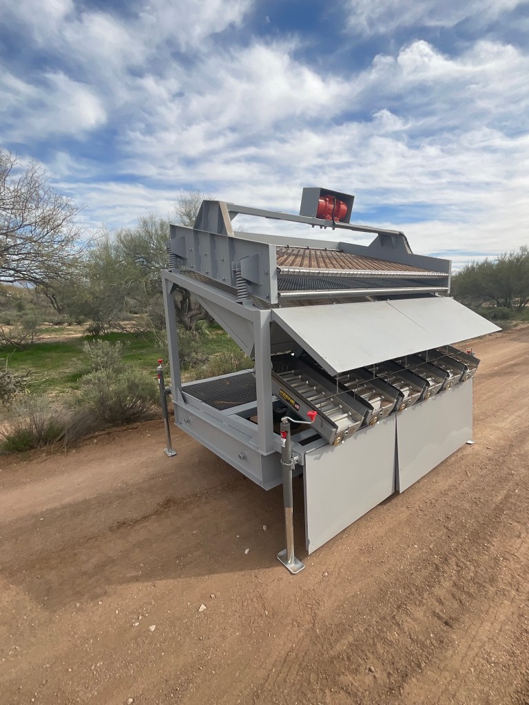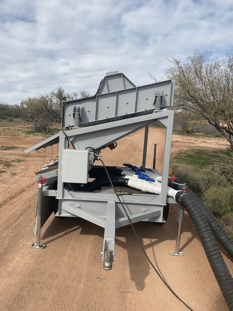 Made from heavy gauge metal and designed with rugged conditions in mind. High clearance axles make it easy to transport to remote areas and down rough roads. Setup takes less than 15 minutes. Course and fine tailings all fall from one side of the unit, therefore reducing how much your skid steer or excavator needs to drive around the plant.